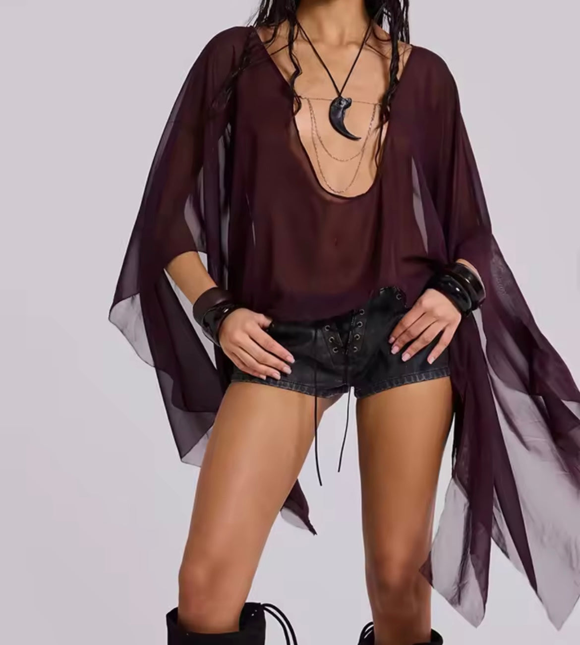 Top en voile bordeaux fluide et transparent. Oversize, audacieux et affirmé : l’arme secrète pour un look VELENOSA inoubliable